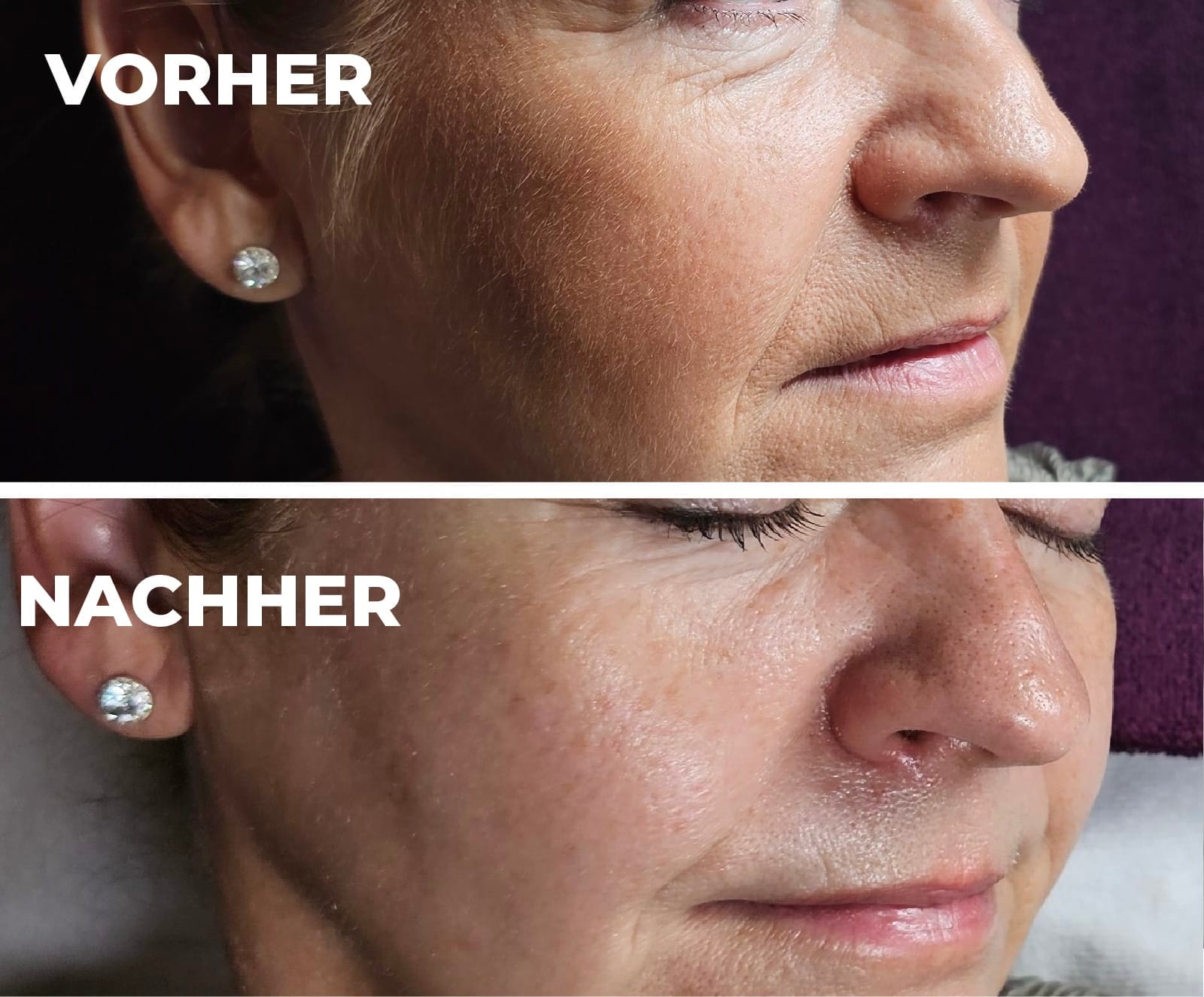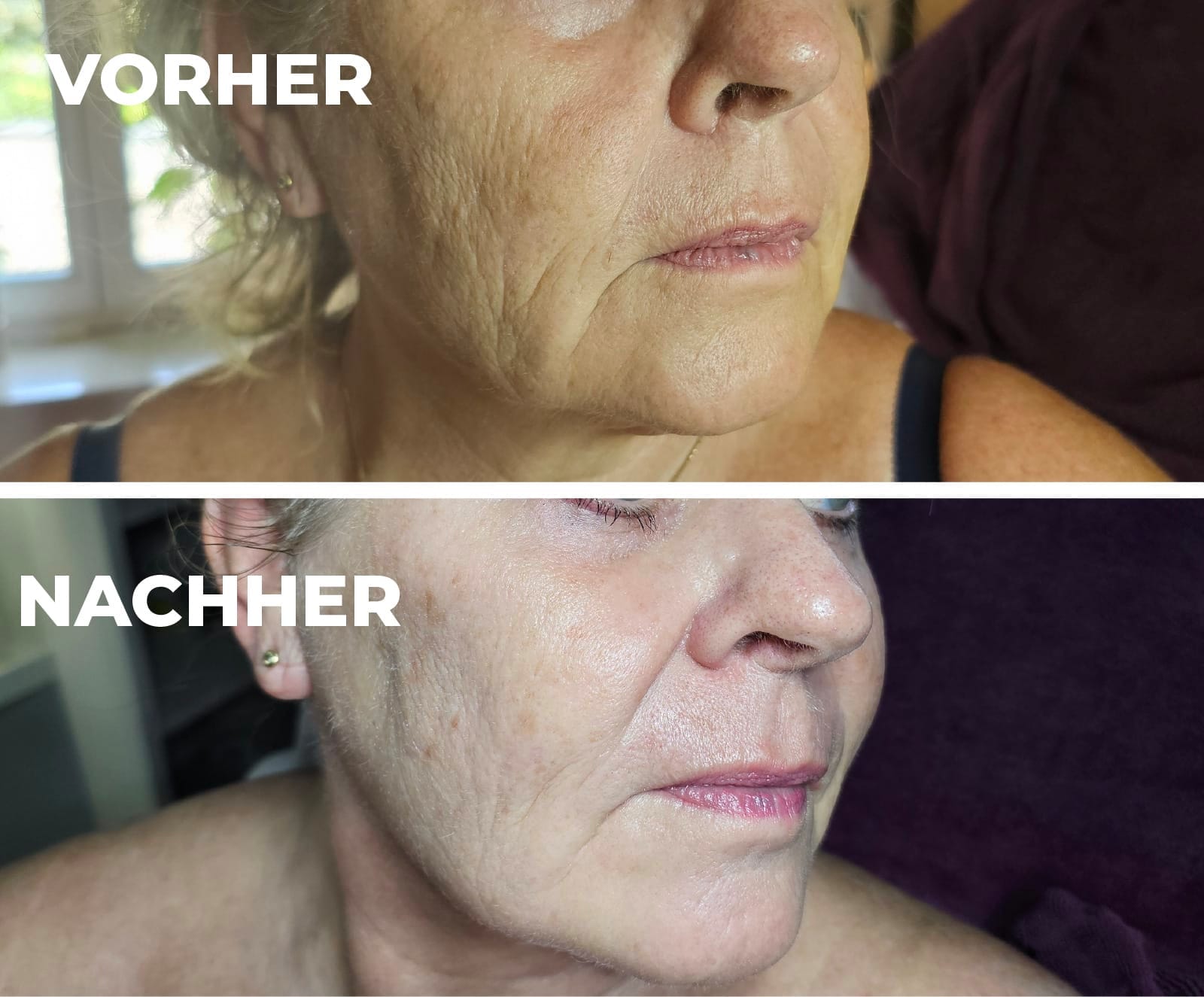 Ihre Falten werden nicht "weggezaubert". Aber ihre Tiefe wird nachweislich reduziert und das gesamte Hautbild verfeinert. Das ist ein realistisches, schönes Ergebnis.